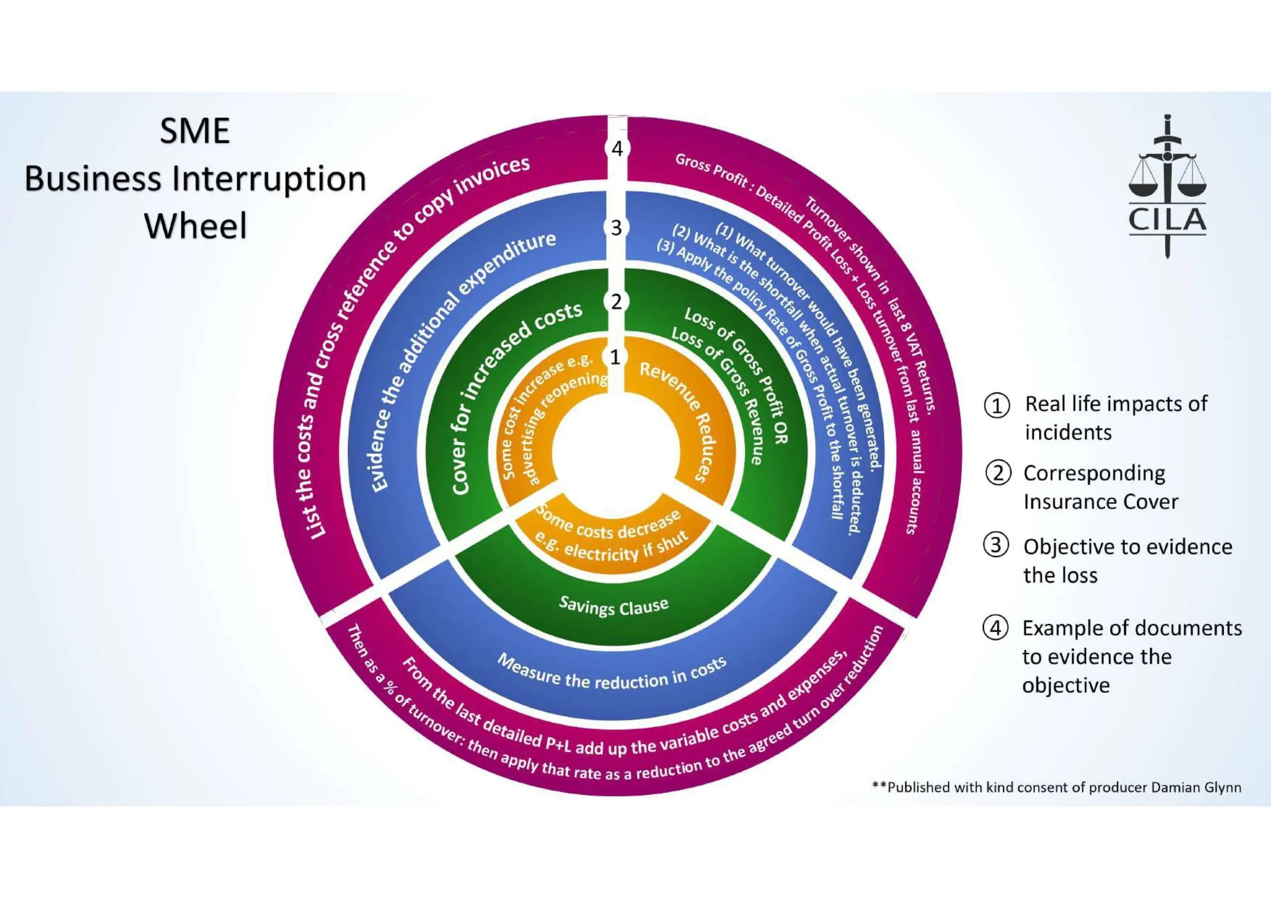 Renowned Business Interruption specialist Damian Glynn (from the Chartered Institute of Loss Adjusters) has helped us to produce the BI Wheel which gives a very basic summary of the way BI works when making a claim.